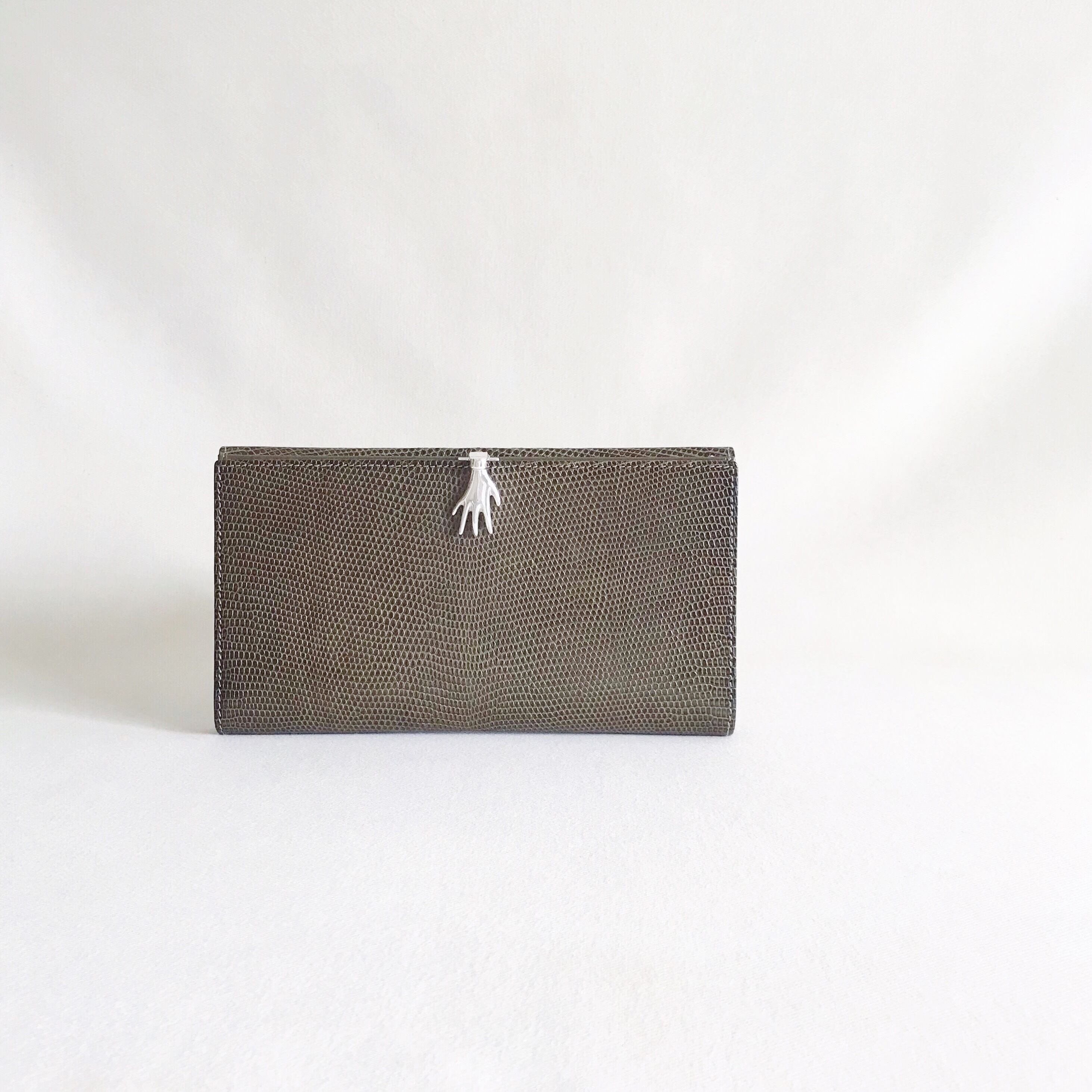 ☆ 80s vintage ☆ オールドグッチ ☆ ハンドモチーフ ☆ 長財布 ☆ リザード ☆ カーキ ☆ シルバー925 ☆ おそらく未使用 ☆